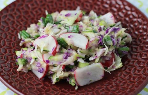 - Mix together zucchini, cabbages, onions, and radishes in a large bowl.